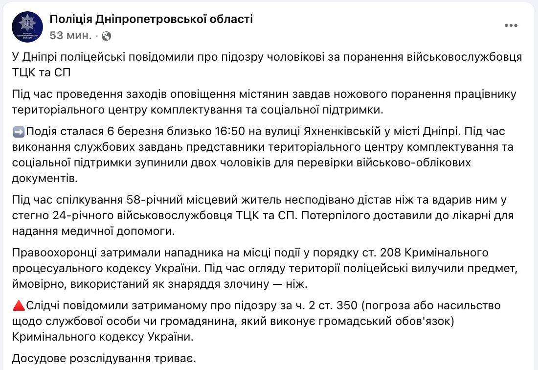 В Днепре очередной мужчина ударил ножом очередного ТЦКашника