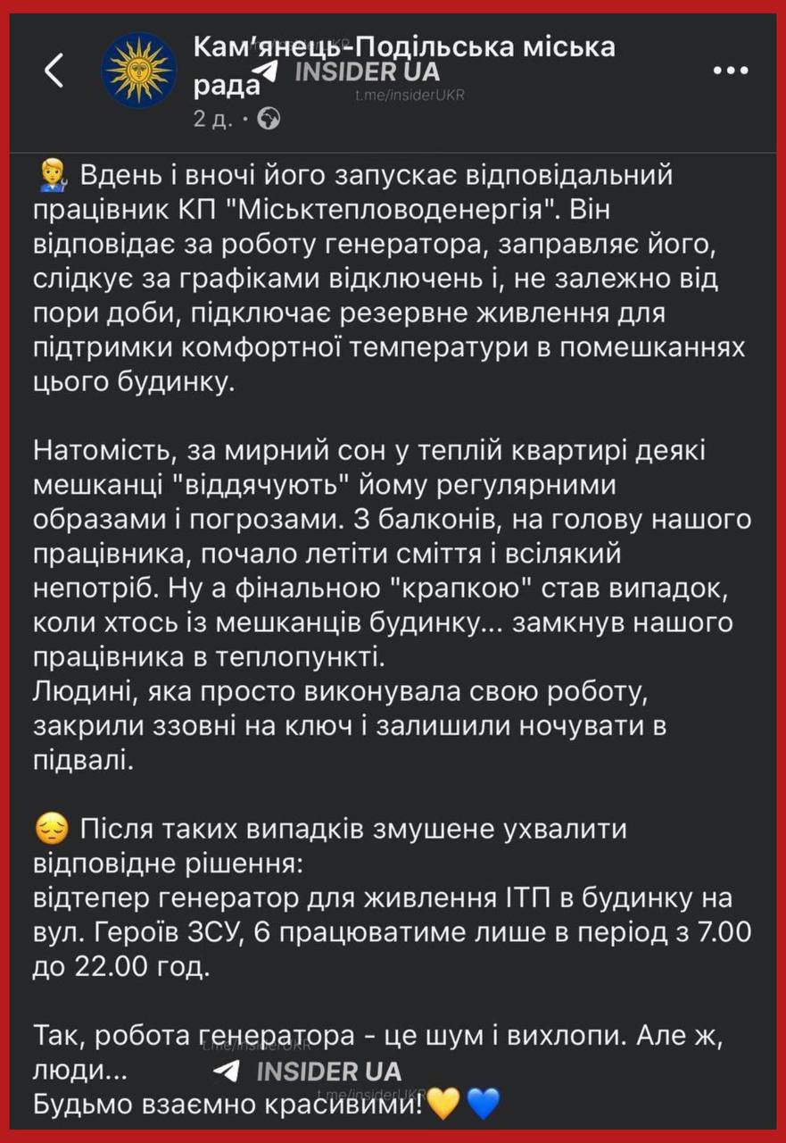 В Каменце-Подольском жильцы дома, в котором коммунальщик из КП «Гортепловодоэнергии» подключал генератор на время отключения электроэнергии, не поняли своего счастья.