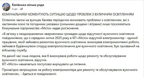«С середины июля 2025 года в КП "Город" отсутствует электромонтёр – единственный работник, который занимался ремонтом уличного освещения, выполнял электромонтажные работы, занимался строительством сооружений для уличного освещения, был призван на военную службу. В настоящее время другой человек, который выполнял бы работы по ремонту и обслуживанию уличного освещения, отсутствует».