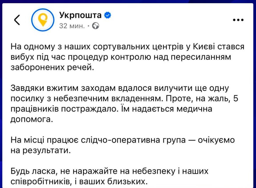 Сегодня в Соломенском районе Киева на почте перед отправкой за границу взорвалась посылка. Трое работников сортировочного центра «Укрпочты» в Соломенском районе и два таможенника получили ранения разной степени тяжести.