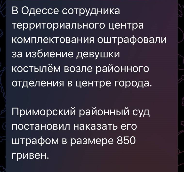 Не знаю, как это комментировать: в Одессе людолов избил костылём девушку возле районного ТЦКа, а Приморский суд назначил ему штарф 850 грн.