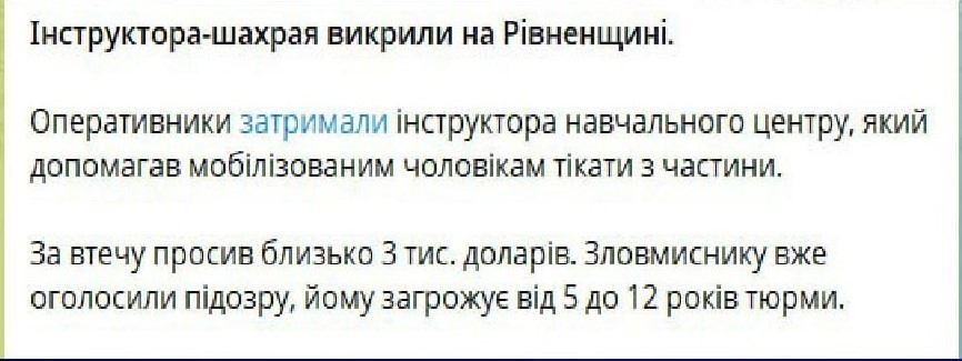 В Ровенской области был задержан ВСУшник, который служил инструктором 104-й бригады теробороны. Он за вполне умеренную плату – 3 тысячи доллров – вывозил вновь мобилизованных с территории учебного центра и доставлял их домой.