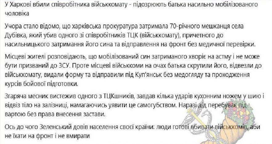 В Харькове произошла вендетта: 70-летний отец пропавшего без вести мобилизованного зарезал ТЦКшника, который участвовал в его бусификации.