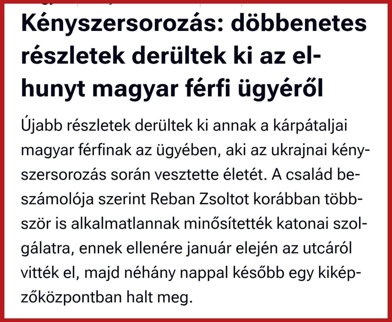 Венгерская газета Magyar Nemzet опубликовала материал о том, что в Закарпатье после грубой насильственной мобилизации погиб гражданин Венгрии Жолт Ребан.