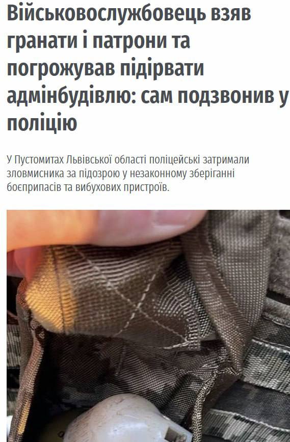 В Пустомытах Львовской области бывший ВСУшник, служивший в 80-й бригаде, угрожал взорвать админздание. Для осуществления этого намерения он затарился большим количеством патронов и гранат.