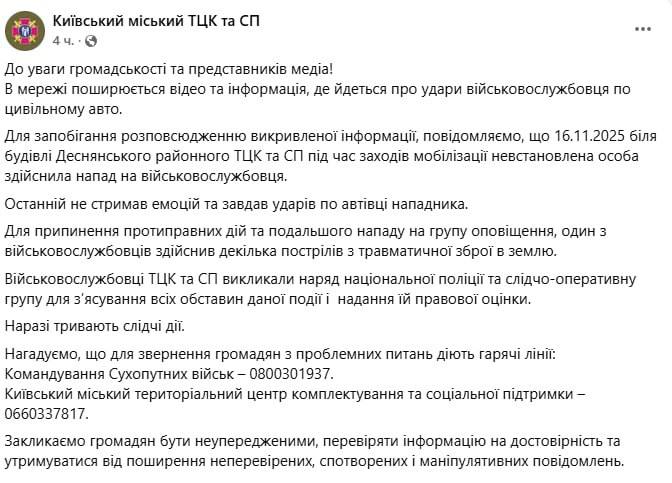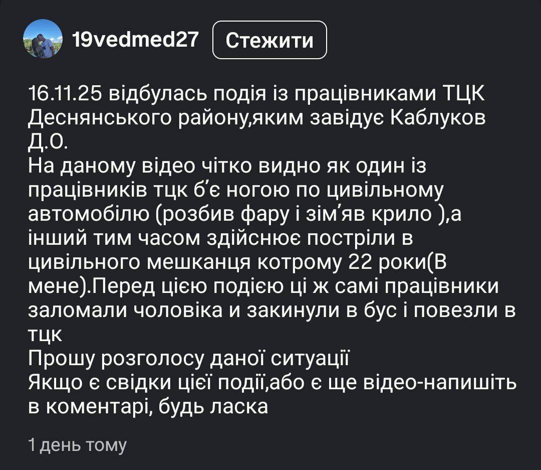В Деснянском районе Киева ТЦКашники, пытаясь бусифицировать мужчину, начали стрелять в него стрелять, разбили ему ногой на машине фару и помяли крыло. Перед этим они уже закинули в свой бус другого мужчину.