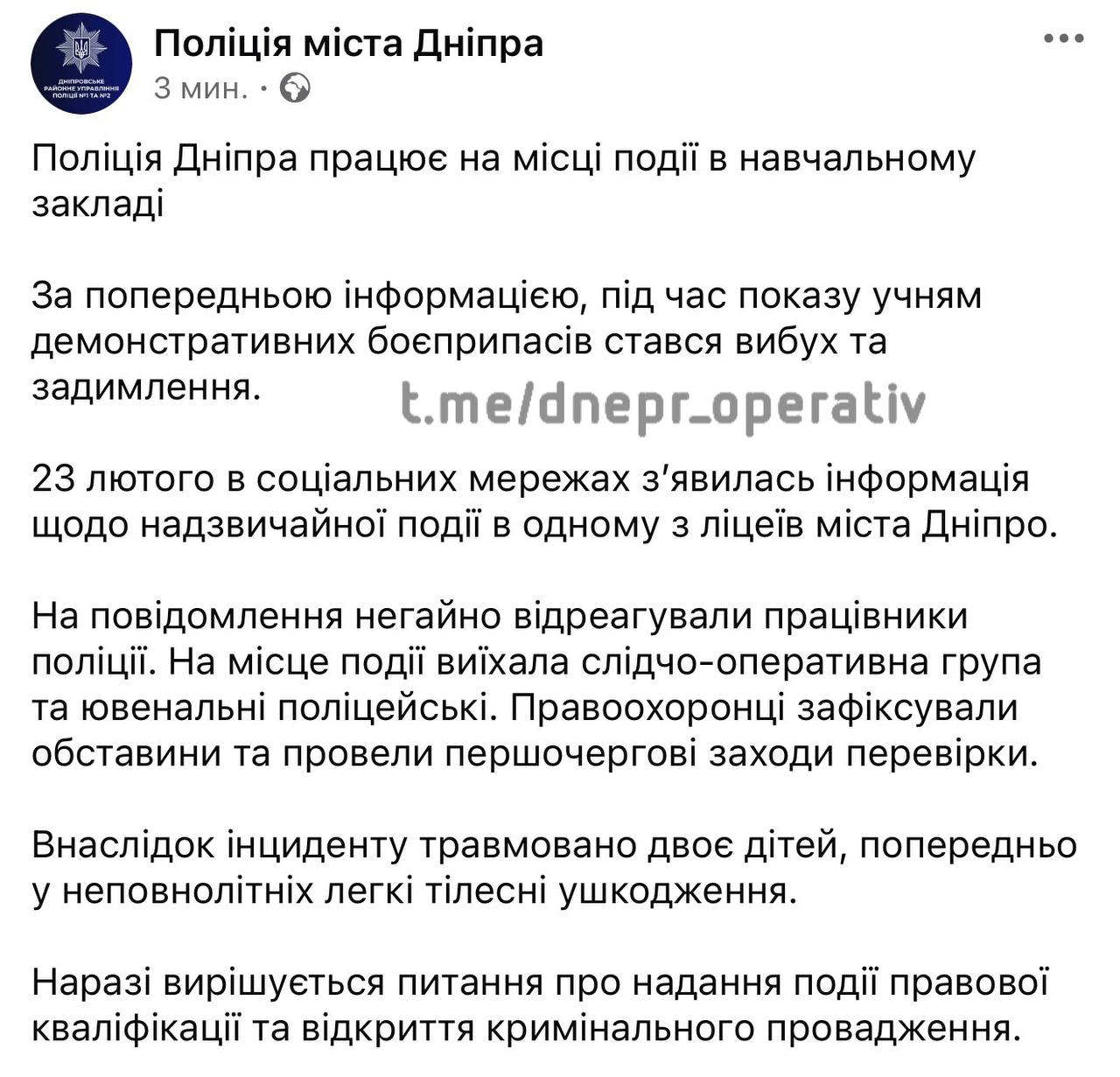 В Днепре произошёл взрыв в лицее №137 – ТЦКашники принесли «муляжи» гранат на урок